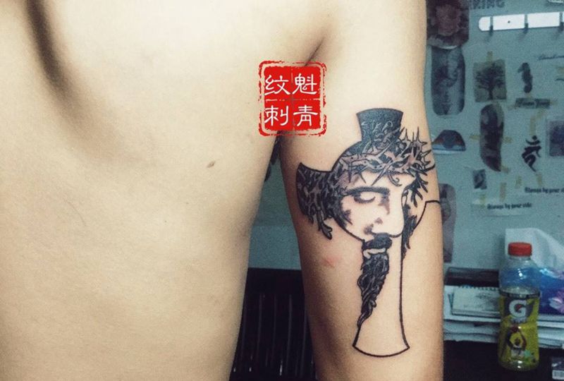耶稣纹身图片_成品手臂欧美人物宗教纹身图案