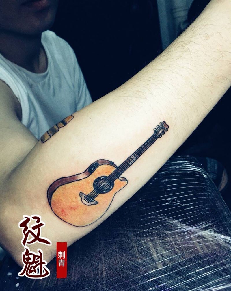 当前位置: 首页 >广东省广州市纹身店-肆海刺青纹身图案>吉他VS小金块纹身图片_成品原创写实手臂纹身图案