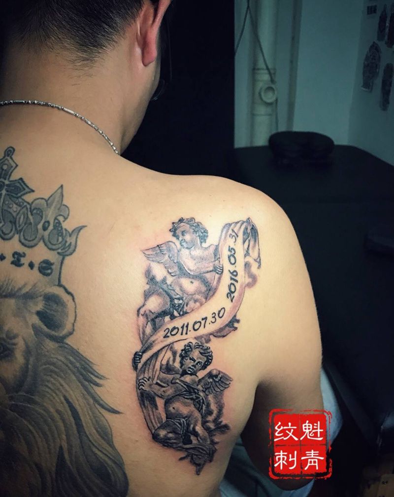 天使纹身图片_成品肩部欧美肖像写实原创宗教人物纹身图案