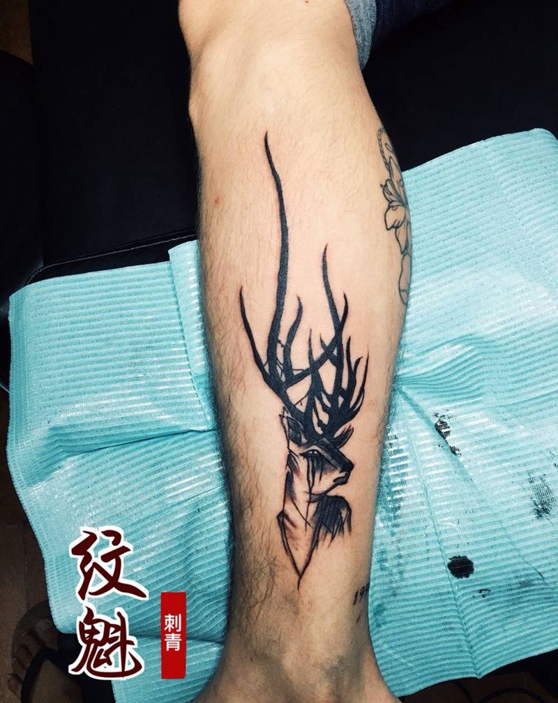 当前位置: 首页 >广东省广州市纹身店-肆海刺青纹身图案>鹿纹身图片_腿部成品欧美动物纹身图案