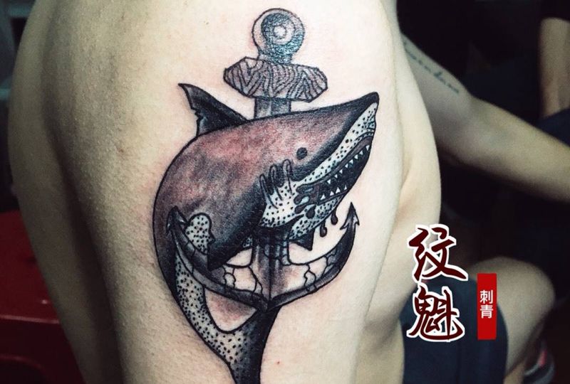 当前位置: 首页 >广东省广州市纹身店-肆海刺青纹身图案>鲨鱼纹身图片_成品手臂欧美动物纹身图案