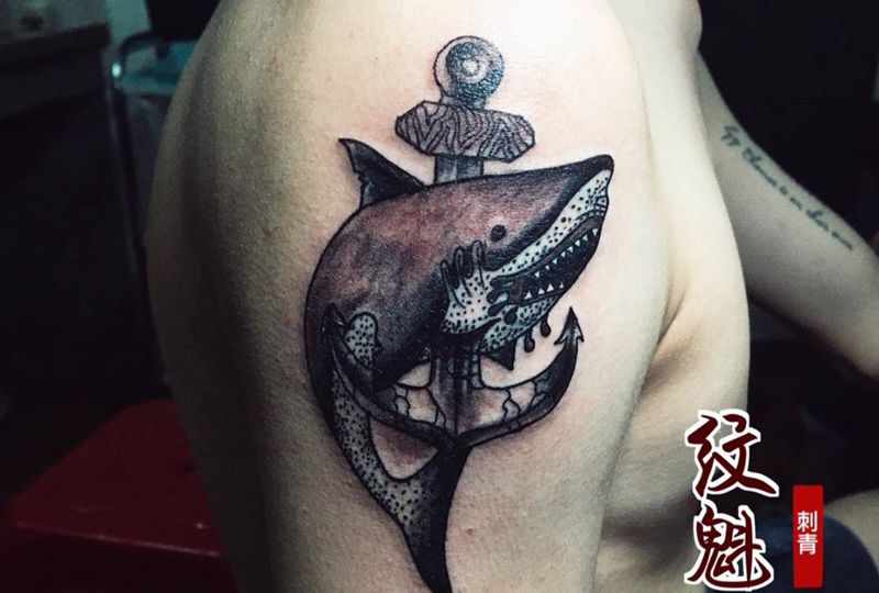 当前位置: 首页 >广东省广州市纹身店-肆海刺青纹身图案>鲨鱼纹身图片_成品手臂欧美动物纹身图案