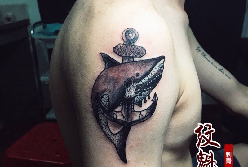 当前位置: 首页 >广东省广州市纹身店-肆海刺青纹身图案>鲨鱼纹身图片_成品手臂欧美动物纹身图案