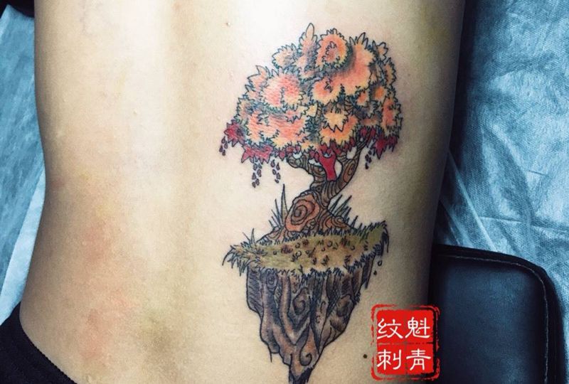 空岛之树纹身图片_成品原创植物静物清新腰部纹身图案