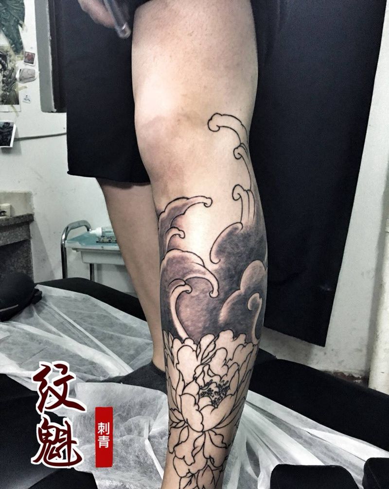 浪花牡丹包小腿纹身图片_成品腿部传统原创植物纹身图案