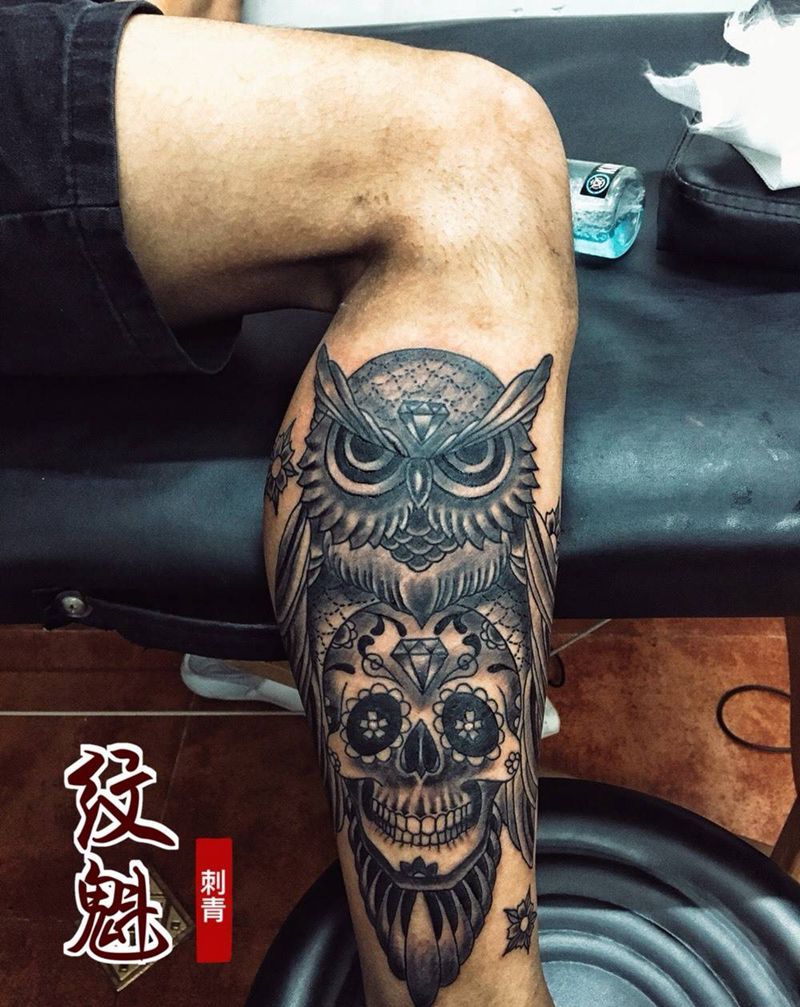 当前位置: 首页 >广东省广州市纹身店-肆海刺青纹身图案>猫头鹰纹身图片_成品腿部欧美动物纹身图案