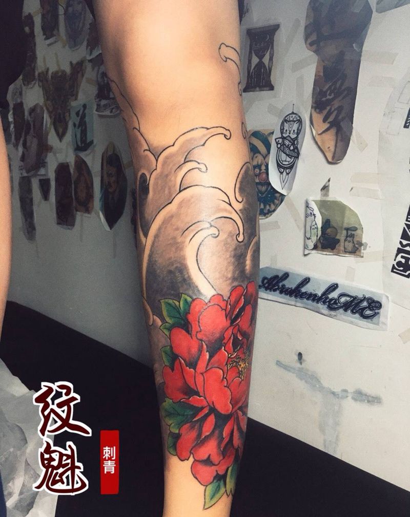 手绘浪花牡丹纹身图片_成品腿部传统植物原创纹身图案