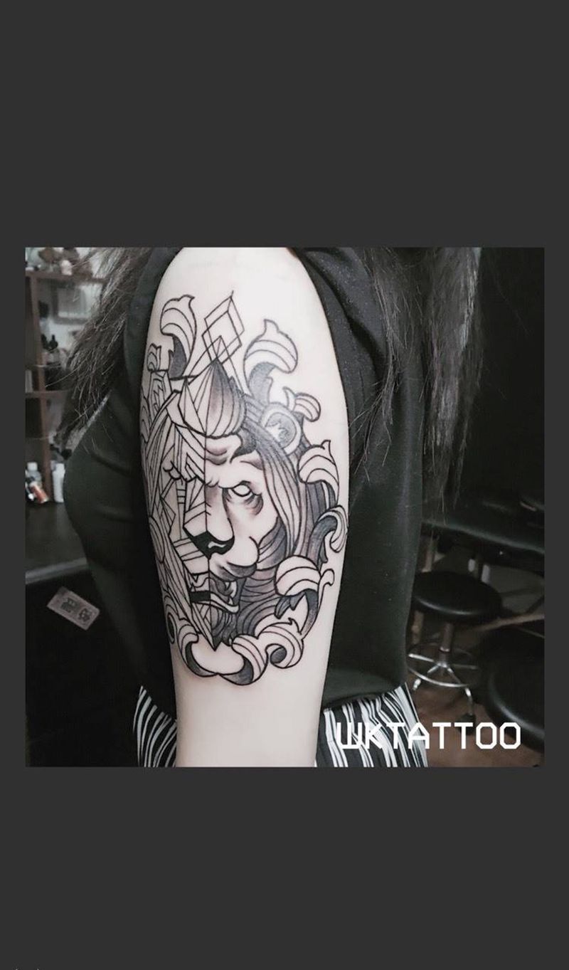 狮子纹身图片_字符几何动物欧美手臂成品纹身图案