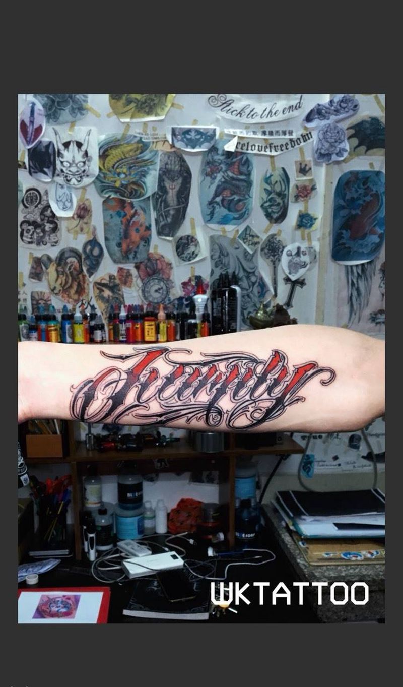 当前位置: 首页 >广东省广州市纹身店-肆海刺青纹身图案>花体英文纹身图片_字符几何欧美手臂成品纹身图案