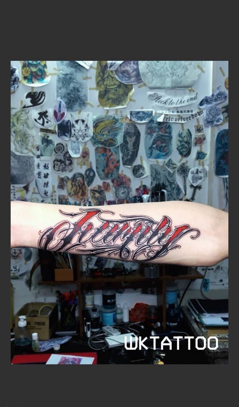 当前位置: 首页 >广东省广州市纹身店-肆海刺青纹身图案>花体英文纹身图片_字符几何欧美手臂成品纹身图案