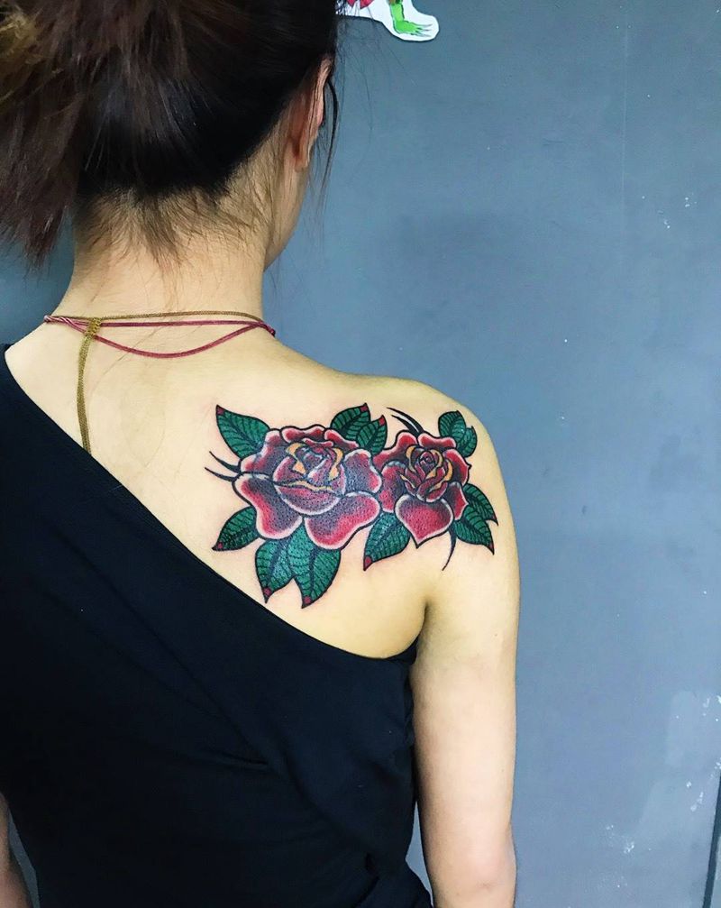 玫瑰遮盖纹身图片_原创植物欧美背部肩部成品手稿纹身图案