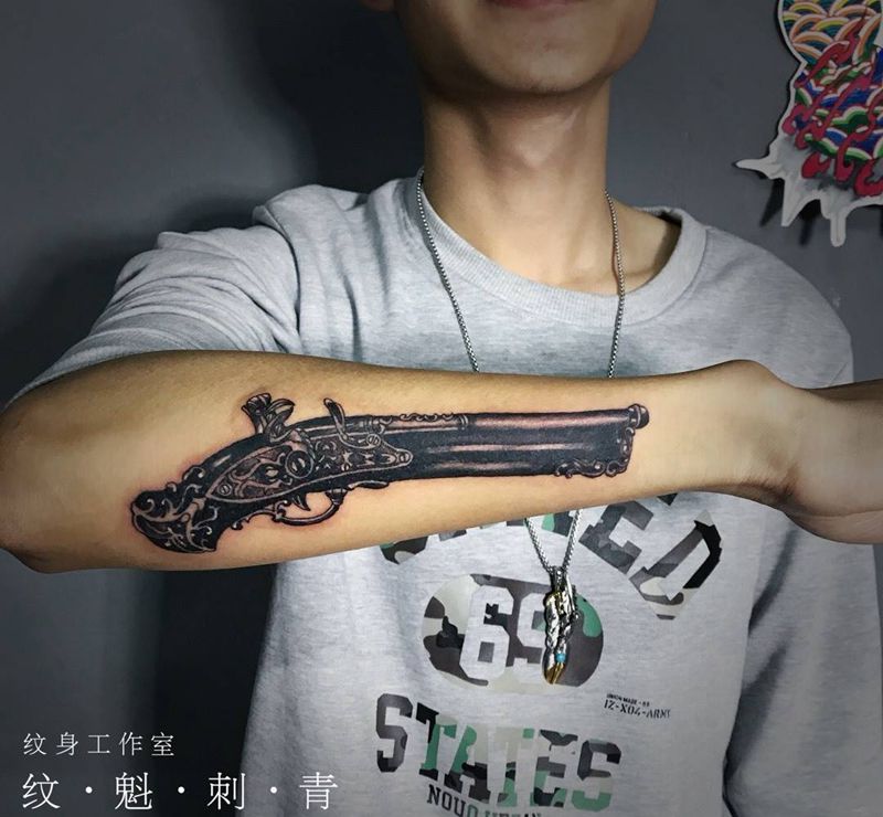 当前位置: 首页 >广东省广州市纹身店-肆海刺青纹身图案>手枪纹身图片_成品手臂欧美写实静物纹身图案