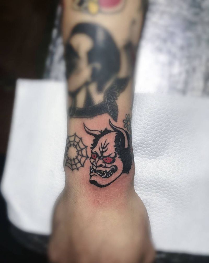 当前位置: 首页 >广东省广州市纹身店-肆海刺青纹身图案>小班若纹身图片_传统手部成品鬼神宗教纹身图案