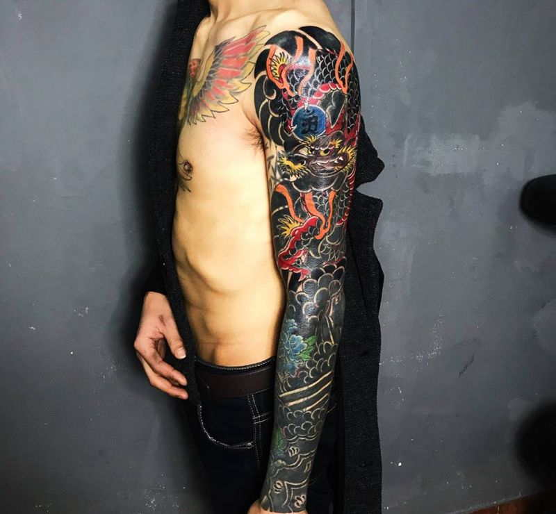 当前位置: 首页 >广东省广州市纹身店-肆海刺青纹身图案>覆盖花臂未完成纹身图片_传统动物成品手臂植物宗教纹身图案