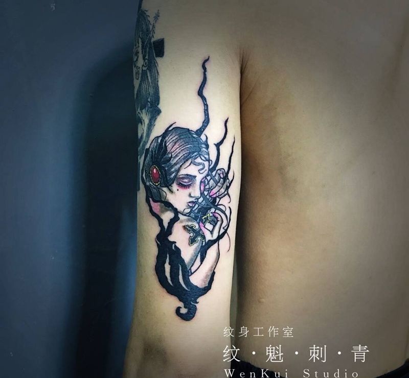 当前位置: 首页 >广东省广州市纹身店-肆海刺青纹身图案>暗黑女纹身图片_人物宗教欧美手臂成品纹身图案