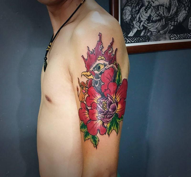 当前位置: 首页 >广东省广州市纹身店-肆海刺青纹身图案>大公鸡纹身图片_手臂New School纹身图案