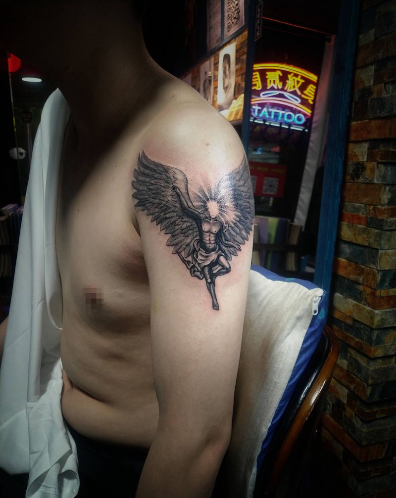 当前位置: 首页 >广东省广州市纹身店-周贰纹身工作室纹身图案>炽天使纹身图片_手臂纹身图案