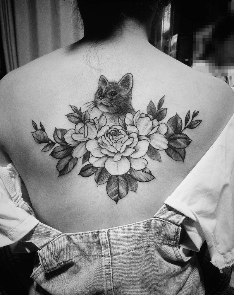 花·猫纹身图片_背部纹身图案