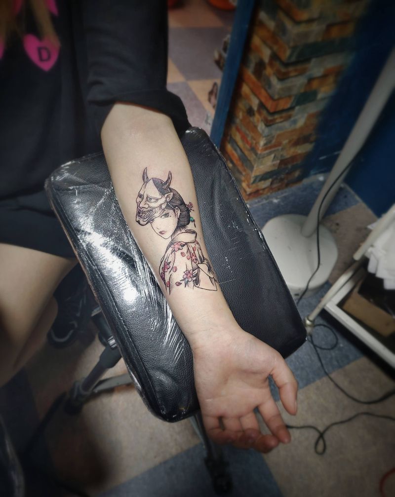 当前位置: 首页 >广东省广州市纹身店-周贰纹身工作室纹身图案>小艺伎×2纹身图片_手臂新传统纹身图案