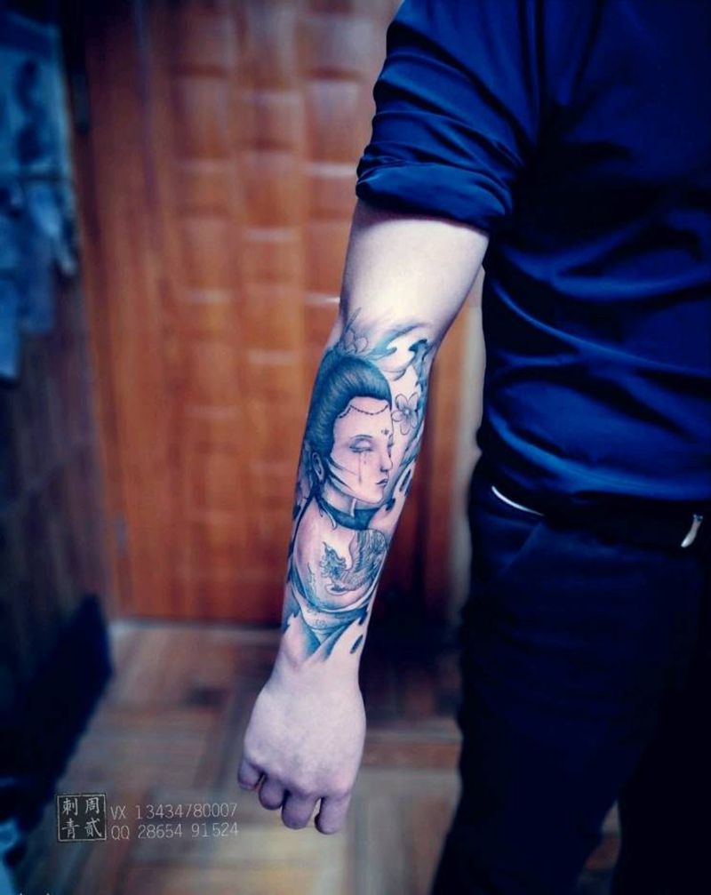 当前位置: 首页 >广东省广州市纹身店-周贰纹身工作室纹身图案>艺伎纹身图片_手臂纹身图案