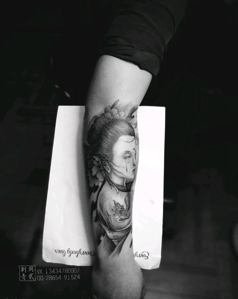 当前位置: 首页 >广东省广州市纹身店-周贰纹身工作室纹身图案>艺伎纹身图片_手臂纹身图案