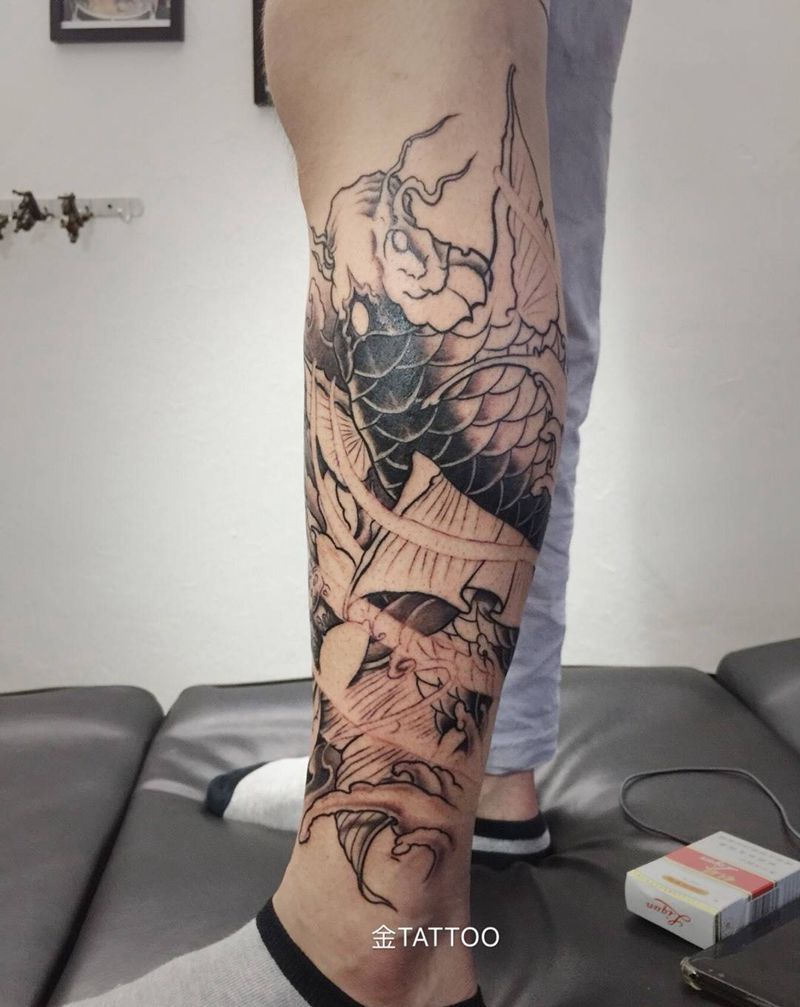 • T网红王老大花腿龙纹身图片_腿部新传统纹身图案