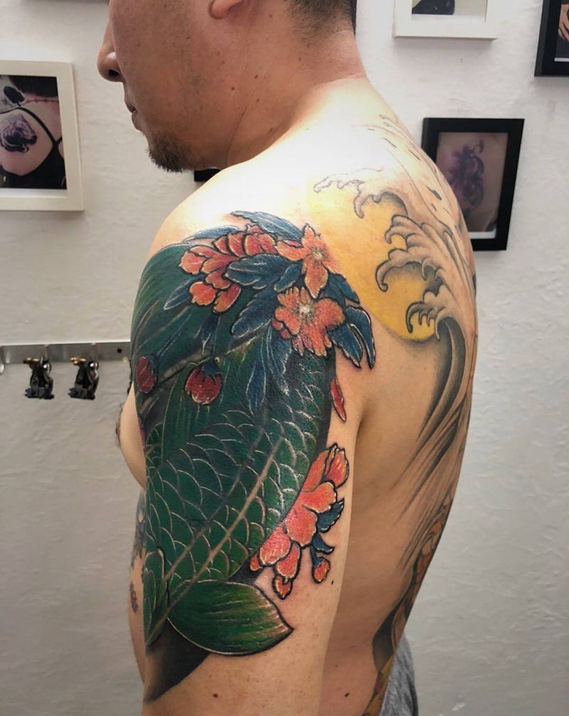 当前位置: 首页 >广东省广州市纹身店-金刺青纹身图案>彩色鲤鱼纹身图片_成品肩部手臂手部传统动物植物纹身图案