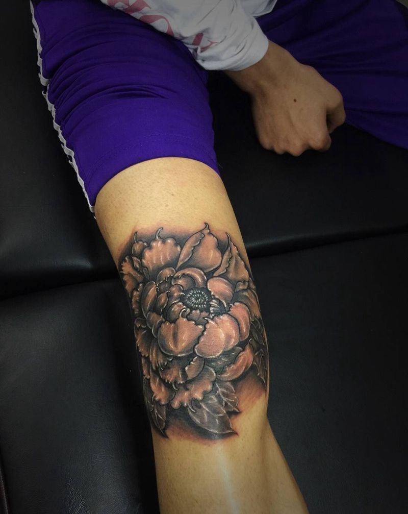 当前位置: 首页 >广东省广州市纹身店-金刺青纹身图案>牡丹花纹身图片_成品脚部腿部欧美传统静物植物膝盖纹身图案