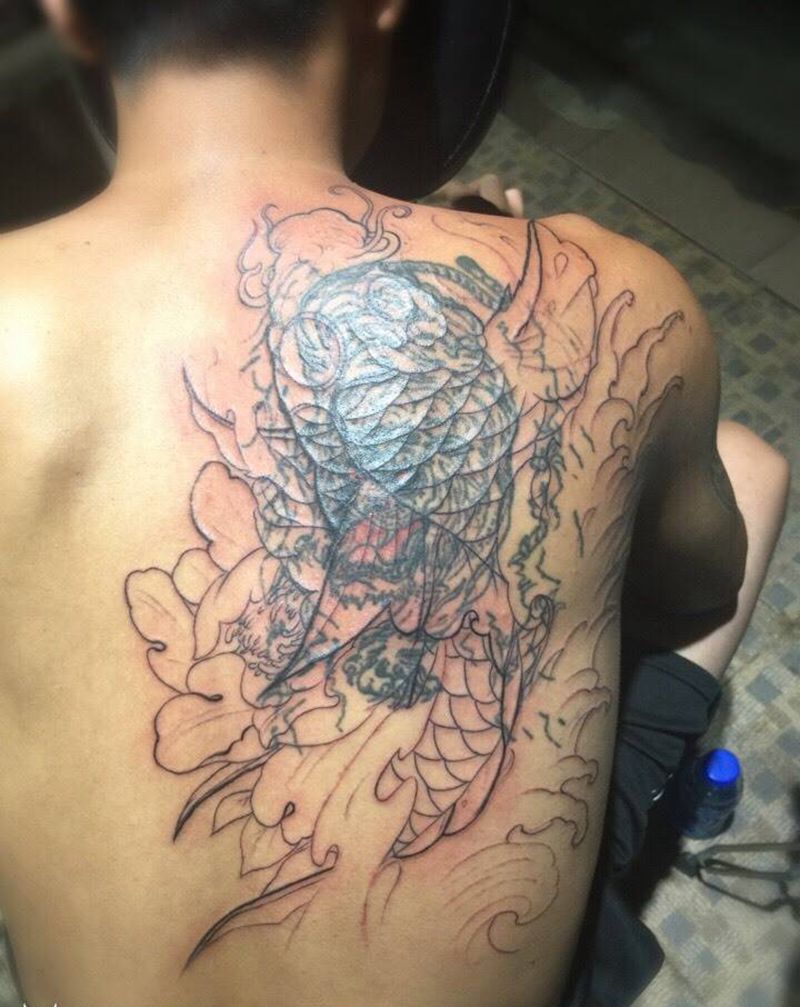 当前位置: 首页 >广东省广州市纹身店-金刺青纹身图案>鲤鱼遮盖纹身图片_成品肩部背部传统动物纹身图案
