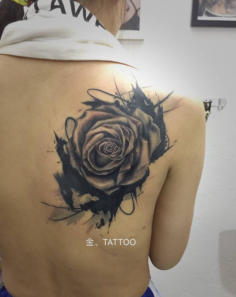 玫瑰花 泼墨风格纹身图片_成品背部肩部颈部欧美写实静物纹身图案