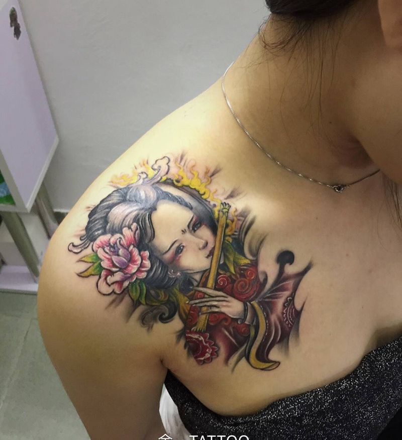 艺妓纹身图片_成品颈部肩部胸部传统清新人物纹身图案