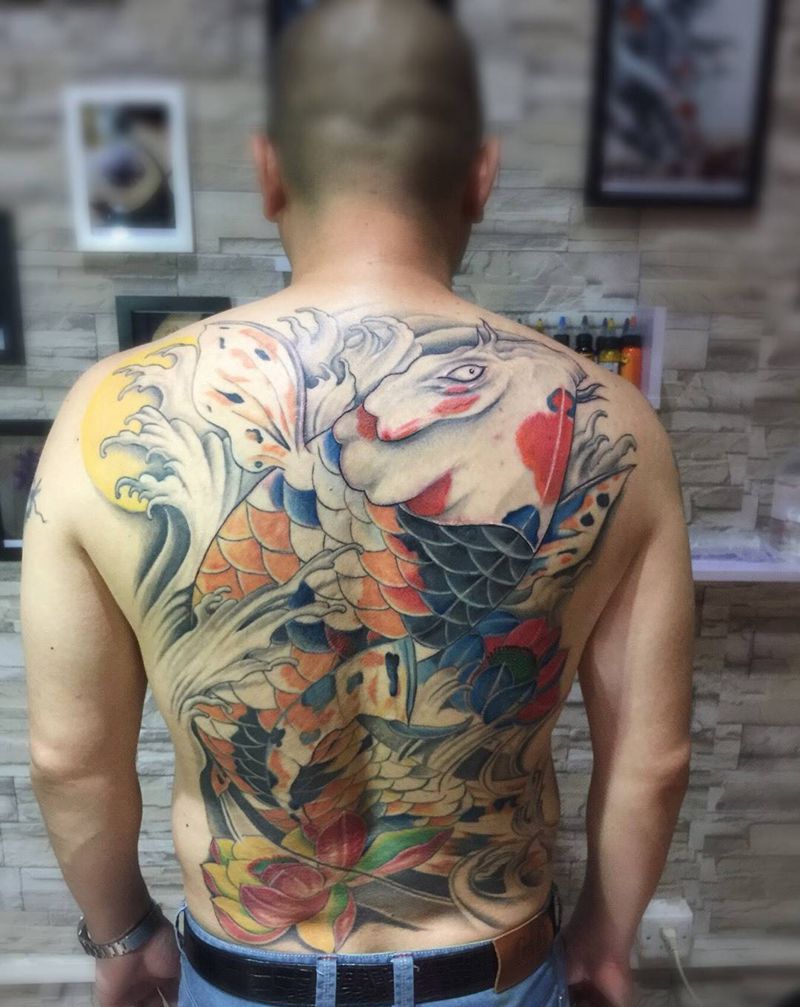 当前位置: 首页 >广东省广州市纹身店-金刺青纹身图案>满背鲤鱼纹身图片_成品颈部肩部腰部背部传统动物纹身图案
