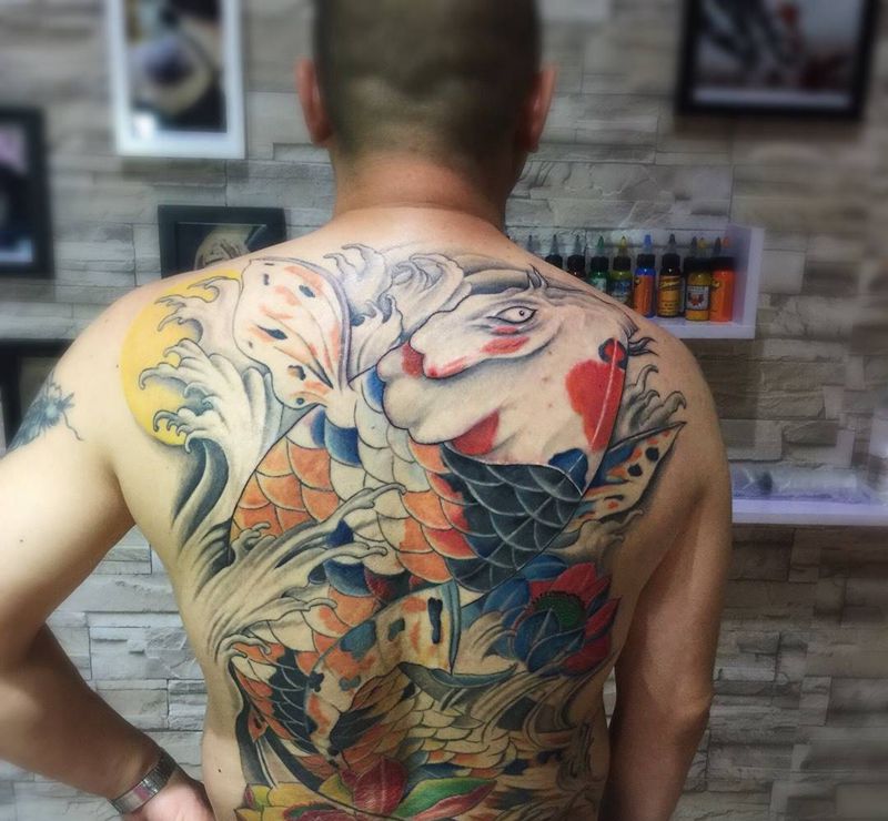 满背鲤鱼纹身图片_成品颈部肩部腰部背部传统动物纹身图案