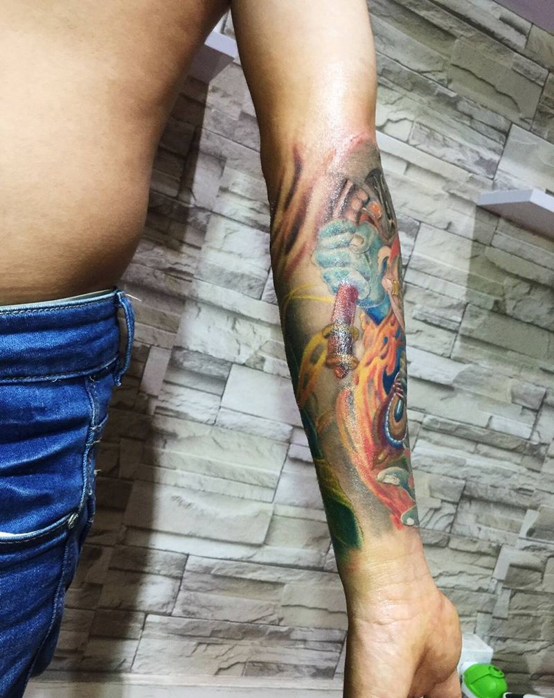 当前位置: 首页 >广东省广州市纹身店-金刺青纹身图案>象神纹身图片_成品手臂手部传统人物鬼神宗教纹身图案