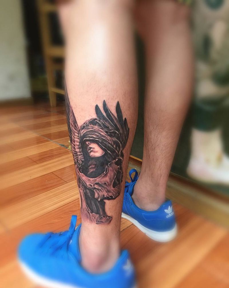 陨落天使纹身图片_成品脚部腿部欧美人物鬼神纹身图案