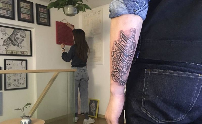 当前位置: 首页 >广东省广州市纹身店-Old duck tattoo纹身图案>花体纹身图片_花体字保持圆寸原创字符欧美手臂成品纹身图案