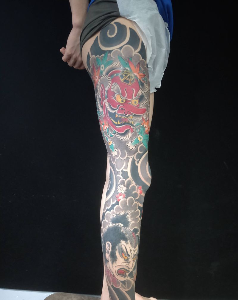 当前位置: 首页 >广东省广州市纹身店-纯针刺青工作室纹身图案>花腿进度纹身图片_腿部老传统纹身图案
