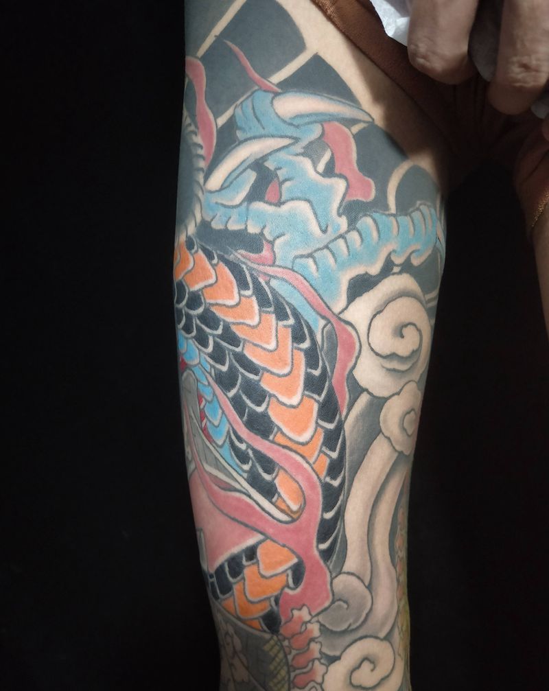 • T网红王老大花腿龙纹身图片_腿部新传统纹身图案