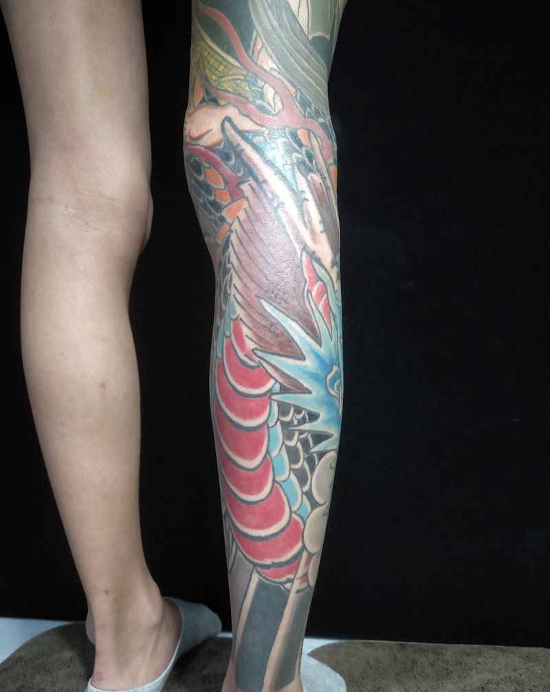 • T网红王老大花腿龙纹身图片_腿部新传统纹身图案