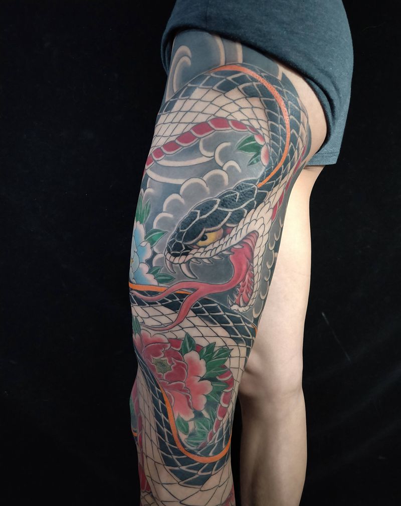 蛇戏牡丹花腿进度纹身图片_腿部老传统蛇牡丹花腿纹身图案
