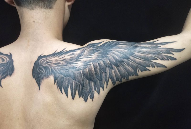 后肩双翼纹身图片_肩部手臂欧美写实翅膀暗黑风格纹身图案