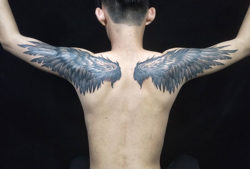 当前位置: 首页 >广东省广州市纹身店-纯针刺青工作室纹身图案>后肩双翼纹身图片_肩部手臂欧美写实翅膀暗黑风格纹身图案