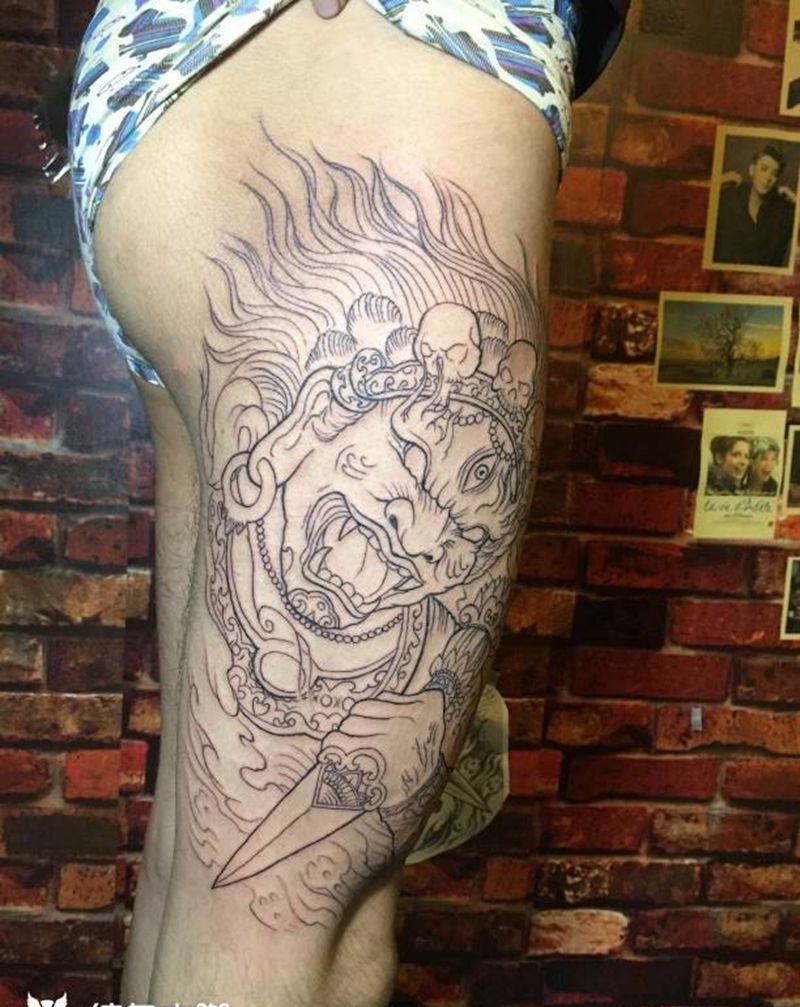 大腿大黑天线条纹身图片_腿部新传统大黑天线条纹身图案