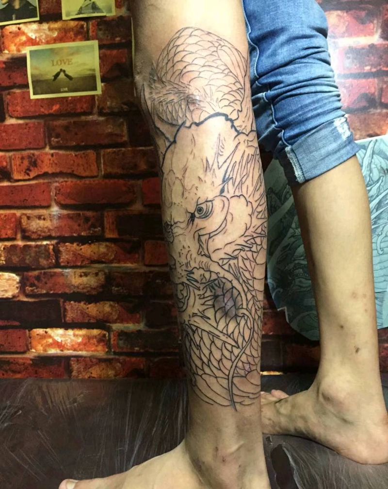 • T网红王老大花腿龙纹身图片_腿部新传统纹身图案