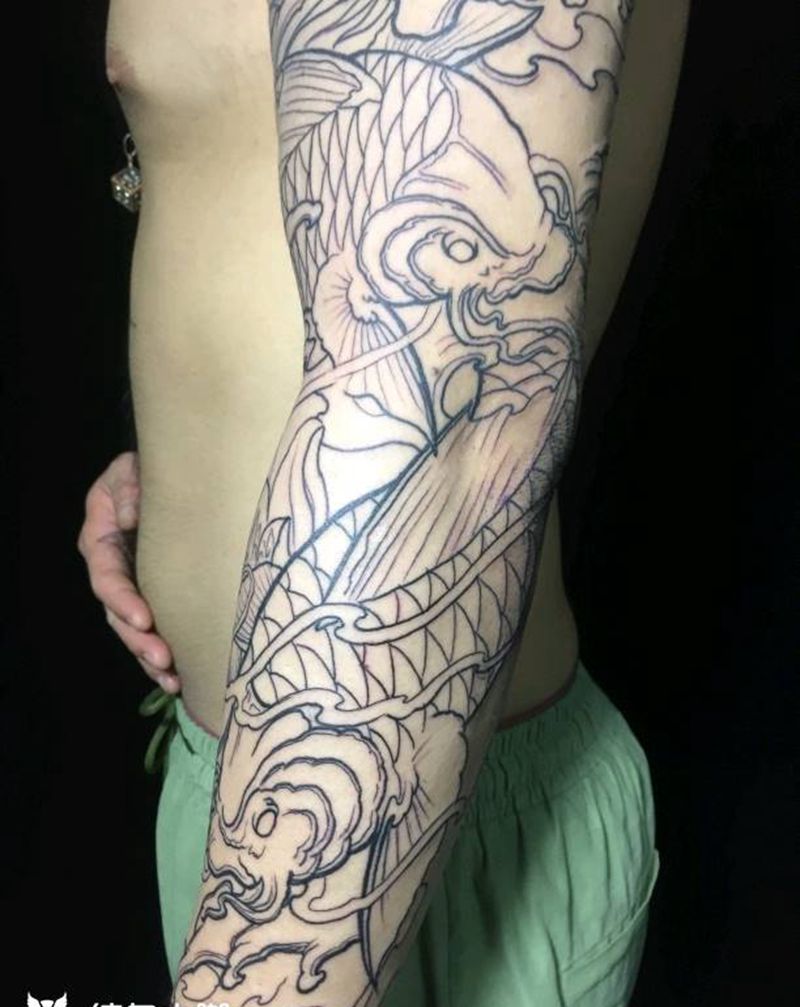 当前位置: 首页 >广东省广州市纹身店-纯针刺青工作室纹身图案>花臂线条般若戏双鲤纹身图片_手臂新传统鲤鱼花臂线条纹身图案