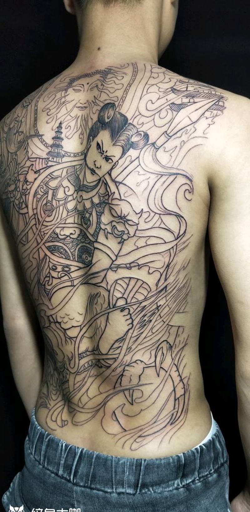 当前位置: 首页 >广东省广州市纹身店-纯针刺青工作室纹身图案>满背哪吒纹身图片_背部新传统哪吒李靖龙纹身图案
