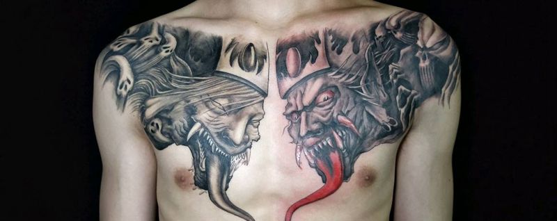 兄弟俩纹身图片_胸部新传统欧美写实黑白无常花胸纹身图案