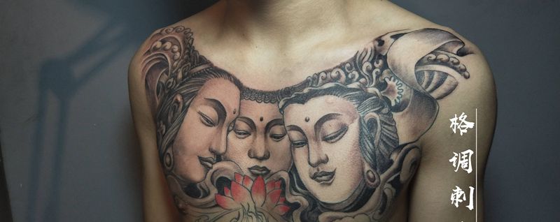 花胸三面佛纹身图片_胸部新传统花胸三面佛纹身图案