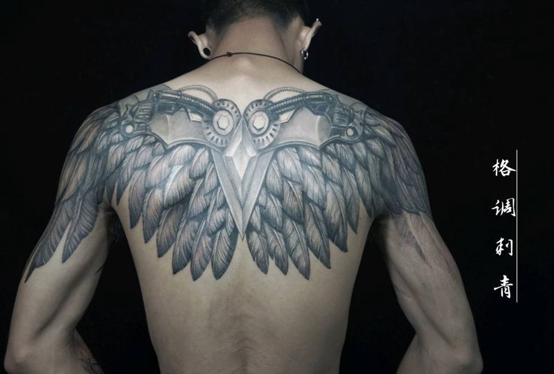 机械翅膀遮盖双枪纹身图片_背部手臂欧美写实机械翅膀纹身图案