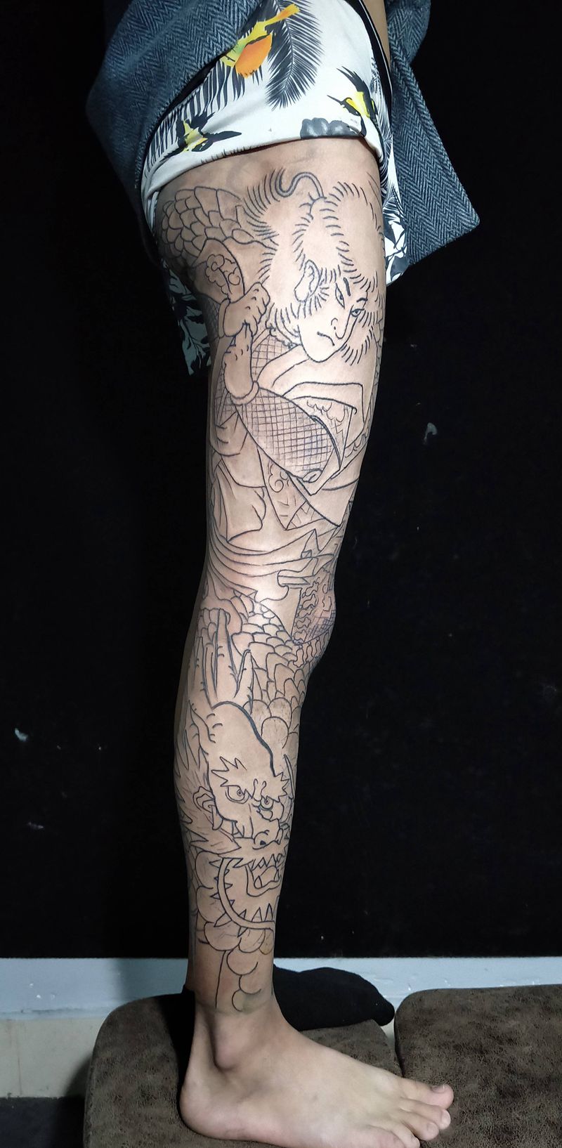 当前位置: 首页 >广东省广州市纹身店-纯针刺青工作室纹身图案>云龙九郎花腿线条纹身图片_腿部老传统云龙九郎花腿纹身图案